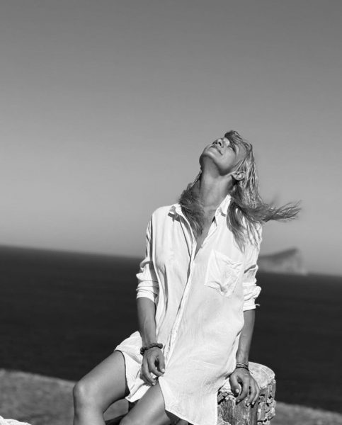 Επίσης, έκανε μία ανάρτηση στον προσωπικό της λογαριασμό στο Instagram, δημοσιεύοντας τρεις φωτογραφίες της. Σε αυτές ποζάρει με φόντο το μπλε της θάλασσας, φορώντας ένα λευκό λινό shirt dress, και λάμπει από ευτυχία.
