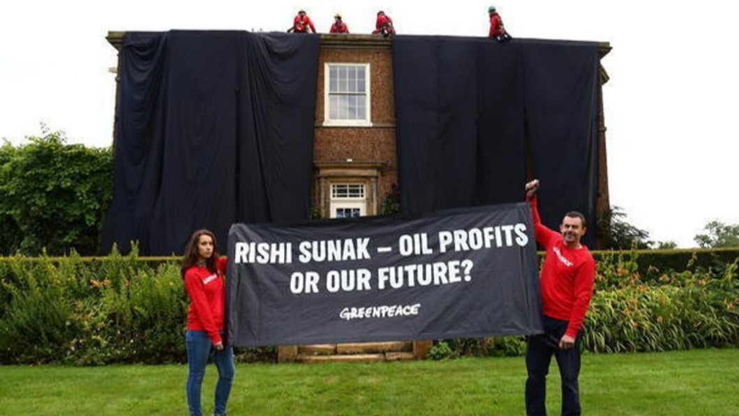 Σε φωτογραφία, που αναρτήθηκε στην πλατφόρμα μηνυμάτων X, πρώην Twitter, από την οργάνωση της Greenpeace στο Ηνωμένο Βασίλειο εικονίζονται τέσσερις διαδηλωτές πάνω στη στέγη της κατοικίας να την καλύπτουν με μαύρο ύφασμα, ενώ δύο άλλοι κρατούν ένα πανό που γράφει «Ρίσι Σούνακ – Πετρελαϊκά κέρδη ή το μέλλον μας;».
