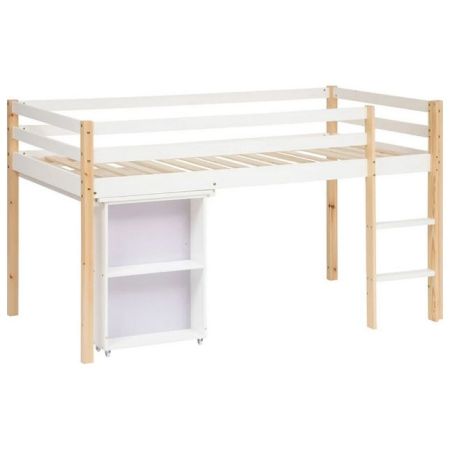 Ρέχει σκελετό από ξύλο πεύκου, ενώ τα ράφια είναι κατασκευασμένα από ξύλο MDF. Οι προεξοχές στο κρεβάτι και η ενσωματωμένη σκάλα προσδίδουν μεγαλύτερη ασφάλεια, ενώ το συρόμενο γραφείο εξοικονομεί χώρο και είναι ιδανικό για να μπορεί το παιδί σας να τρώει ή να διαβάζει εκεί.