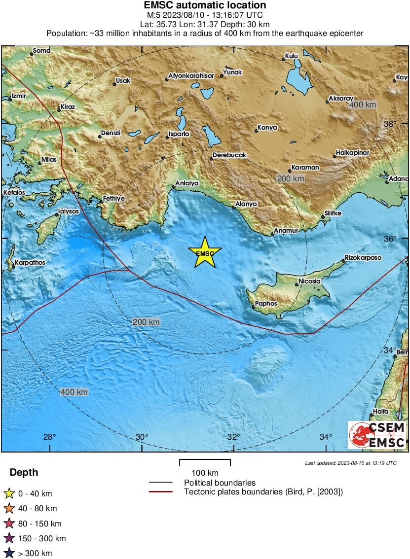 Να σημειωθεί ότι ο σεισμός έγινε ιδιαίτερα αισθητός τόσο στην περιοχή της Αττάλειας στην Τουρκία, όσο και στην Κύπρο, αλλά και στις ακτές του Λιβάνου.