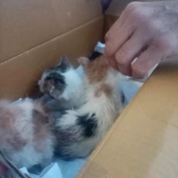 Η γυναίκα που τα βρήκε, τα φιλοξένησε για λίγο, ώσπου η Φιλοζωϊκή Ομάδα να βρει κάποιον για να τα αναλάβει. Τα γατάκια είναι περίπου τριών εβδομάδων. Ήδη έχει γίνει καταγγελία και μήνυση κατά αγνώστων.
