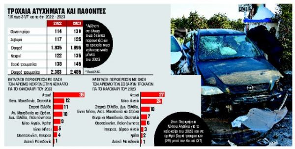 Τα επίσημα στοιχεία της ΕΛ.ΑΣ. για το διάστημα από 1η Ιουνίου έως και 31 Ιουλίου καταγράφουν αύξηση όσον αφορά το 2023 συγκριτικά με τους αντίστοιχους δύο περσινούς μήνες, τόσο σε επίπεδο αριθμού τροχαίων (θανατηφόρα, σοβαρά, ελαφρά) όσο και σε επίπεδο ανθρώπινων απωλειών και τραυματισθέντων (νεκροί, βαριά τραυματίες, ελαφρά τραυματίες).