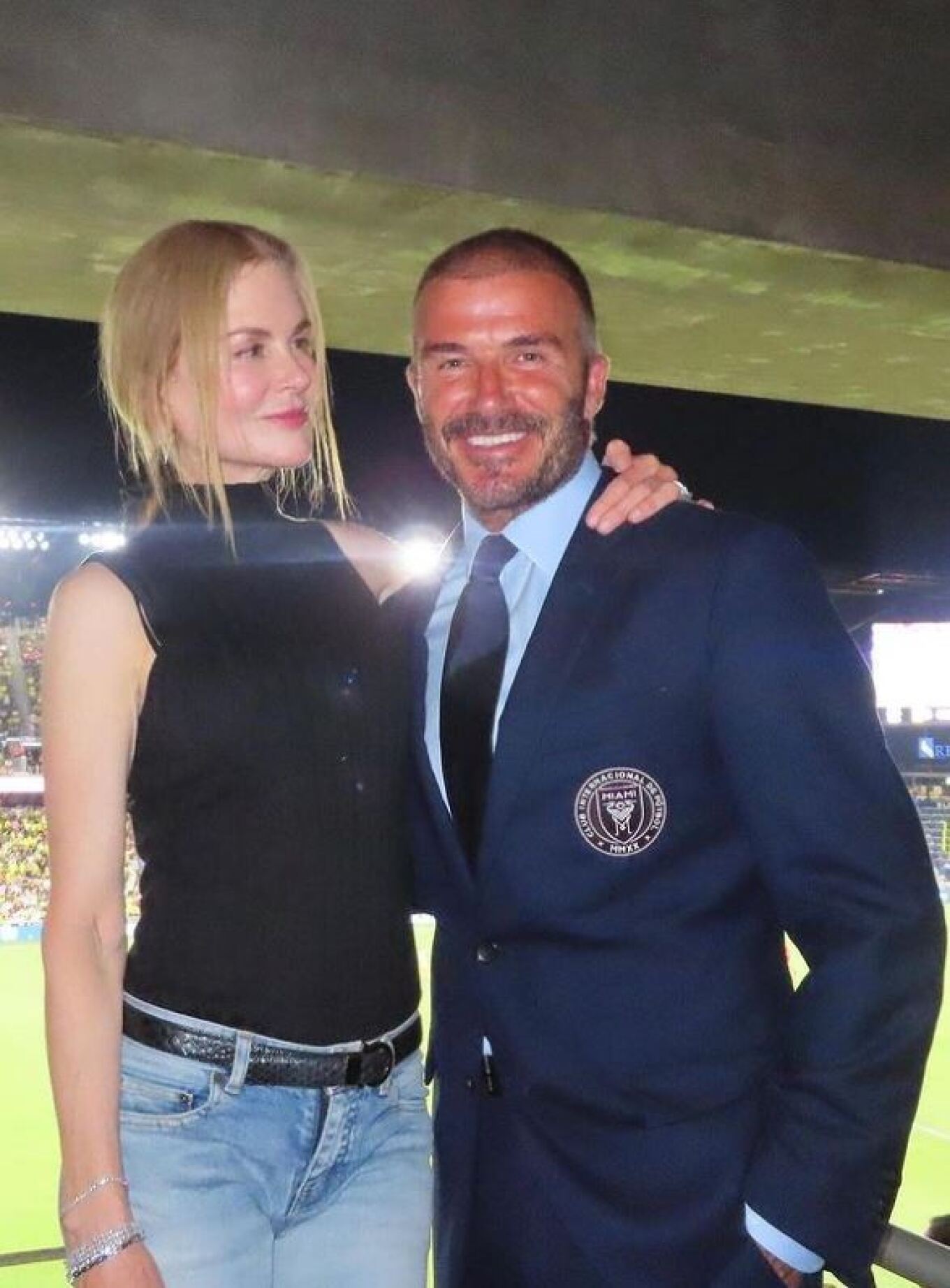 Οι δύο σταρ του Χόλιγουντ πόζαραν μαζί στην εξέδρα αλλά απογοητεύτηκαν γρήγορα όταν είδαν τον Λιονέλ Μέσι να πετυχαίνει νωρίς γκολ και να χαλάει το πάρτι.