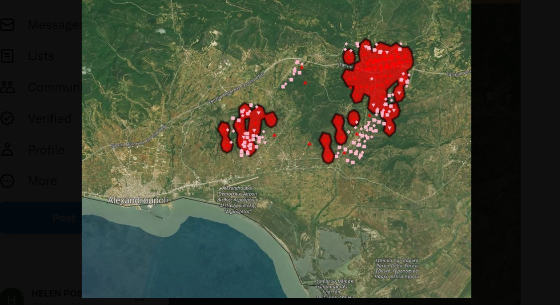 Στη σχετική ανάρτηση αναφέρεται πως οι κόκκινες περιοχές είναι οι καμένες και τα ροζ σημεία αναφέρονται στα ενεργά μέτωπα.