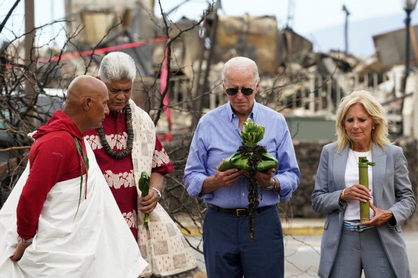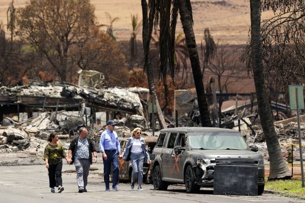 Συνοδευόμενος από τη σύζυγό του Τζιλ πέταξε με ελικόπτερο πάνω από τις κατεστραμμένες περιοχές. Σε έναν δρόμο της Λαχάινα, μεγάλο μέρος της οποίας έχει καταστραφεί ολοσχερώς, ο Αμερικανός πρόεδρος σταμάτησε για να χαϊδέψει έναν σκύλο που συμμετέχει στις έρευνες για νεκρούς στα ερείπια.