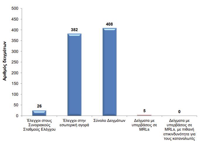 Ειδικότερα, σύμφωνα με τα στοιχεία αυτά ΥπΑΑΤ, τον Ιούνιο του 2023 διενεργήθηκαν 408 έλεγχοι, εκ των οποίων οι 382 ήταν στην εσωτερική αγορά και οι 26 στους συνοριακούς σταθμούς ελέγχου. Από το σύνολο των δειγμάτων, τα 5 εντοπίστηκαν με υπερβάσεις σε MRLs, ενώ κανένα από τα δείγματα δεν είχαν υπέρβαση σε MRLs, με πιθανή επικινδυνότητα για τους καταναλωτές.