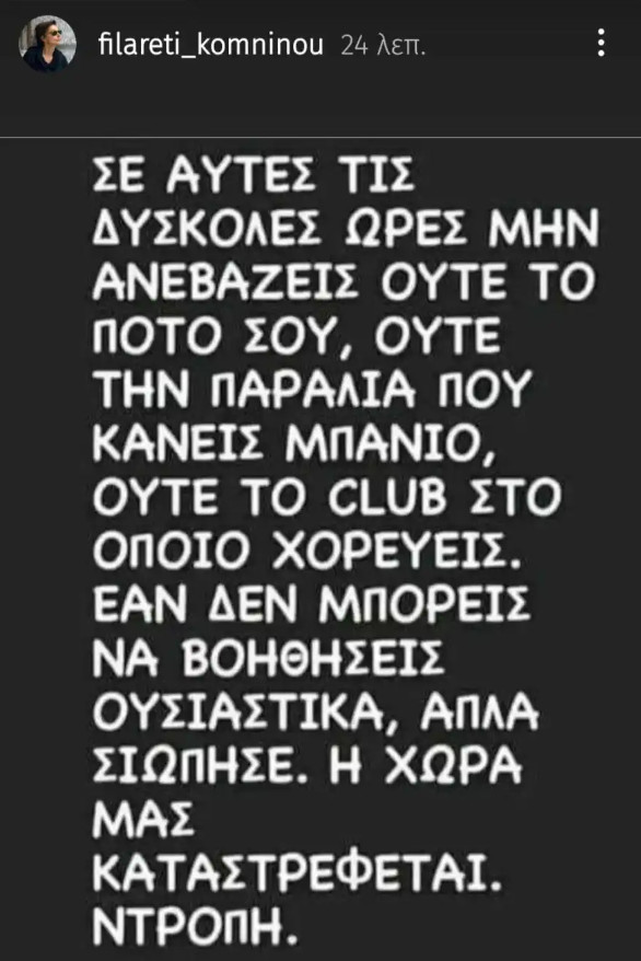 Συγκεκριμένα, στο story της έγραψε: «Σε αυτές τις δύσκολες ώρες μην ανεβάζεις ούτε το ποτό σου, ούτε την παραλία που κάνεις μπάνιο, ούτε το club στο οποίο χορεύεις. Εάν δεν μπορείς να βοηθήσεις ουσιαστικά, απλά σιώπησε. Η χώρα μας καταστρέφεται. Ντροπή».
