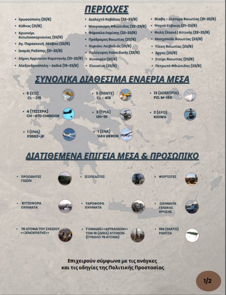 Όπως έγινε γνωστό από το ΓΕΕΘΑ, σήμερα επιχειρούν στα ενεργά μέτωπα των πυρκαγιών σε ολόκληρη την επικράτεια, συνολικά 6 πυροσβεστικά αεροσκάφη CL-215, 5 πυροσβεστικά αεροσκάφη CL-415, 13 πυροσβεστικά αεροσκάφη PZL και 4 ελικόπτερα CHINOOK.