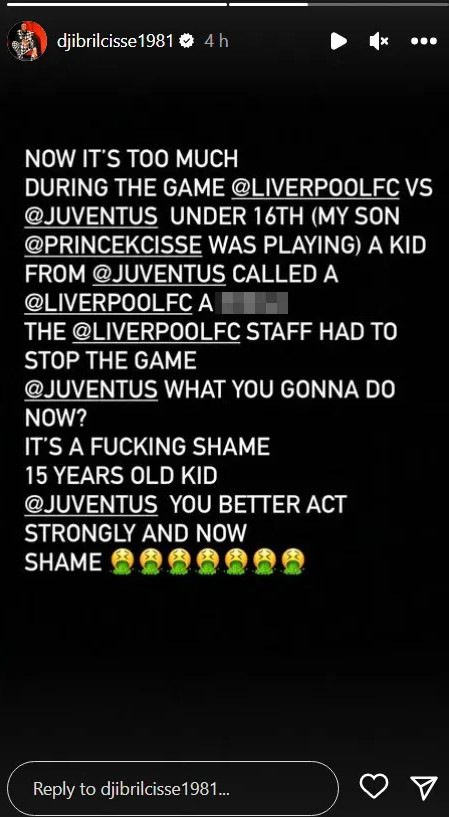Η είδηση αποκαλύφθηκε από τον πρώην άσο της Λίβερπουλ και του Παναθηναϊκού, Τζιμπρίλ Σισέ, ο οποίος με δημοσίευση του στο Instagram έκανε γνωστό το περιστατικό και εξέφρασε την οργή του, ζητώντας από το επιτελείο της Γιουβέντους να πάρει θέση.