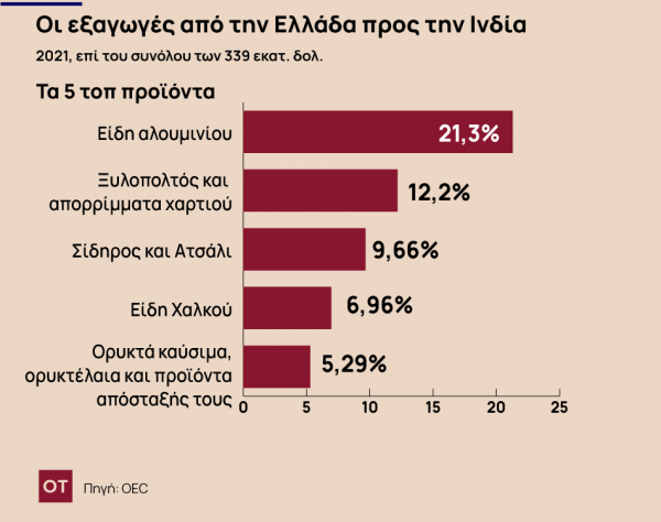 Την ίδια χρονιά, η Ελλάδα εξήγαγε προϊόντα αξίας 339 εκατ. δολαρίων στην Ινδία. Τα κύρια προϊόντα που εξήγαγε η Ελλάδα στην Ινδία ήταν το ανακυκλωμένο χαρτί (41,4 εκατομμύρια δολάρια), το προς ανακύκλωση αλουμίνιο (36,4 εκατομμύρια δολάρια) και ο προς ανακύκλωση σίδηρος (29 εκατομμύρια δολάρια). Τα τελευταία 26 χρόνια οι εξαγωγές της Ελλάδας στην Ινδία αυξήθηκαν με ετήσιο ρυθμό 8,98%, από 36,3 εκατομμύρια δολάρια το 1995 σε 339 εκατομμύρια δολάρια το 2021.