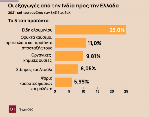 Σύμφωνα το Παρατηρητήριο Οικονομικής Πολυπλοκότητας (Observatory of Economic Complexity – OEC), ιστότοπο που προσφέρει οπτικοποιημένα δεδομένα για το διεθνές εμπόριο, το 2021 η Ινδία εξήγαγε προϊόντα αξίας 1,43 δισ. δολαρίων στην Ελλάδα. Τα κύρια προϊόντα που εξήγαγε η Ινδία στην Ελλάδα είναι το ακατέργαστο αλουμίνιο (342 εκατομμύρια δολάρια), το διυλισμένο πετρέλαιο (157 εκατομμύρια δολάρια) και ο επικαλυμμένος σίδηρος έλασης (91,9 εκατομμύρια δολάρια). Τα τελευταία 26 χρόνια οι εξαγωγές της Ινδίας προς την Ελλάδα αυξήθηκαν με ετήσιο ρυθμό 10,1%, από 118 εκατομμύρια δολάρια το 1995 σε 1,43 δισεκατομμύρια δολάρια το 2021.