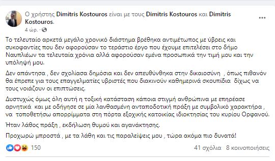 Ο κ. Κωστούρος συμπληρώνει πως «ήταν λάθος πράξη, εκδήλωση θυμού και αγανάκτησης».