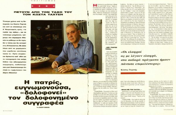 Στον «Ταχυδρόμο» που είχε κυκλοφορήσει στις 29 Ιουλίου 1992 υπήρχε ένα τετρασέλιδο δημοσίευμα για το λογοτέχνη Κώστα Ταχτσή, που έφερε την υπογραφή του δημοσιογράφου Βασίλη Καββαθά.
