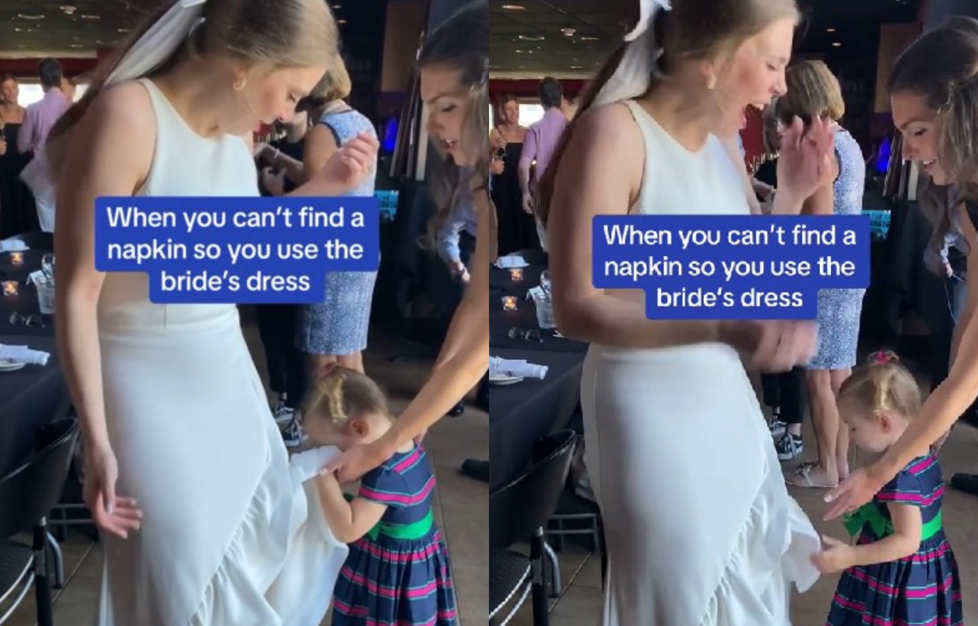 Στο σύντομο κλιπ, που έχει αναρτηθεί στο TikTok και μετρά πάνω από ένα εκατομμύριο προβολές και χιλιάδες προβολές, ένα νήπιο πλησιάζει τη νύφη και χρησιμοποιεί αδιάφορα το λευκό νυφικό της ως πετσέτα για να σκουπίσει το πρόσωπό της.