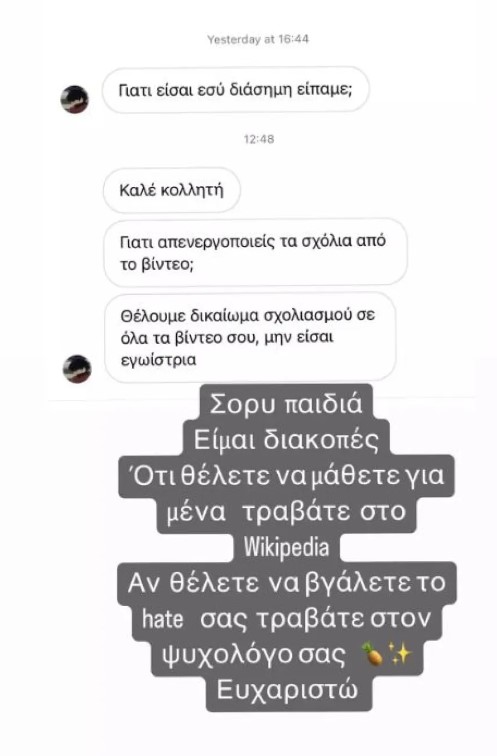 Τότε, εκείνη του απάντησε μέσα από ένα story: «Sorry παιδιά, είμαι διακοπές. Ό,τι θέλετε να μάθετε για μένα τραβάτε στο Wikipedia. Αν θέλετε να βγάλετε το hate σας, τραβάτε στον ψυχολόγο σας».
