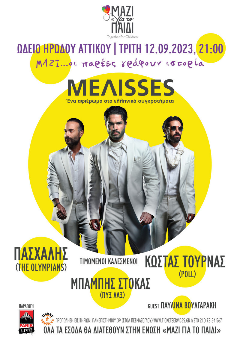 Τιμώμενοι καλεσμένοι μας τρεις πολύ σημαντικοί frontmen σπουδαίων συγκροτημάτων, ο Πασχάλης από τους Olympians, ο Μπάμπης Στόκας από τους Πυξ Λαξ και ο Κώστας Τουρνάς από τους Poll . Μαζί μας θα είναι και η Παυλίνα Βουλγαράκη», αναφέρουν σε βίντεο που «ανέβασαν» στα social media οι MEΛΙSSES, προσθέτοντας πως όλα τα έσοδα της συναυλίας θα διατεθούν για το «Μαζί για το Παιδί».