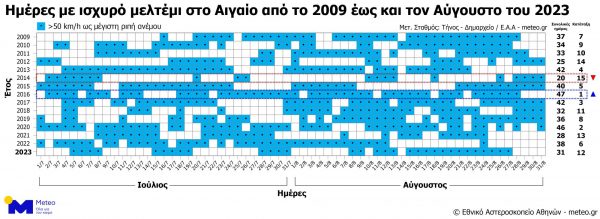 Ο πίνακας που ακολουθεί παρουσιάζει τις ημέρες με ισχυρό μελτέμι στο Αιγαίο (γαλάζια κελιά) από το 2009 έως και τον Αύγουστο του 2023.