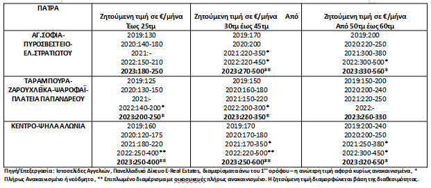 Για παράδειγμα, στην Πάτρα το κόστος μίσθωσης κατοικίας έως 25τμ κυμαίνεται από 180€/μήνα έως 250€/μήνα, ενώ για κατοικία 30τμ-45τμ αγγίζει ακόμη και τα 500€/μήνα για κατοικία πλήρως ανακαινισμένη ή/και νεόδμητη. Οικονομικότερη λύση αποτελούν οι περιοχές Ταραμπούρα, Ζαρουχλεϊκά, Ψαροφαϊ και Πλατεία Παπανδρέου.