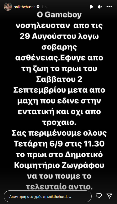 Και πρόσθεσε: «Ο Gameboy νοσηλευόταν από τις 29 Αυγούστου λόγω σοβαρής ασθένειας. Έδινε μετά από μάχη που έδινε στην εντατική και όχι σε τροχαίο».