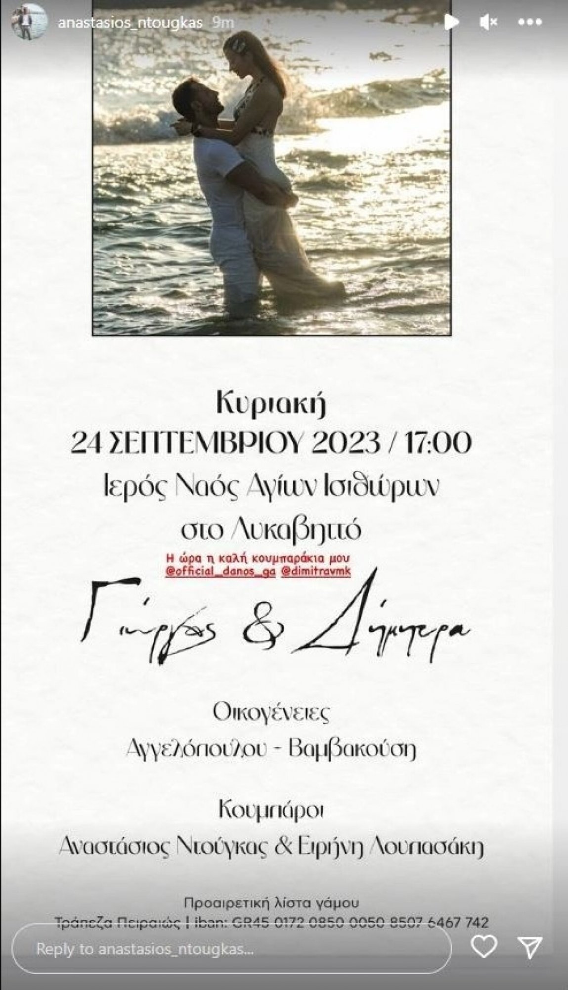Το χαρμόσυνο γεγονός επιβεβαίωσε και ο δικηγόρος Αναστάσιος Ντούγκας ανεβάζοντας σε story στον προσωπικό του λογαριασμό στο Instagram το προσκλητήριο του γάμου του ζευγαριού, ο οποίος θα πραγματοποιηθεί στις 24 Σεπτεμβρίου στην Αθήνα.