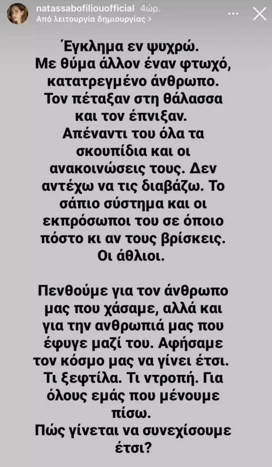 Έγραψε συγκεκριμένα: «Έγκλημα εν ψυχρώ. Με θύμα άλλον έναν φτωχό, κατατρεγμένο άνθρωπο. Τον πέταξαν στη θάλασσα και τον έπνιξαν. Απέναντί του όλα τα σκουπίδια και οι ανακοινώσεις τους. Δεν αντέχω να τις διαβάζω. Το σάπιο σύστημα και οι εκπρόσωποί του σε όποιο πόστο και αν τους βρίσκεις. Οι άθλιοι. Πενθούμε για τον άνθρωπό μας που χάσαμε, αλλά και για την ανθρωπιά μας που έφυγε μαζί του. Αφήσαμε τον κόσμο μας να γίνει έτσι. Τι ξεφτίλα. Τι ντροπή. Για όλους εμάς που μένουμε πίσω. Πώς γίνεται να συνεχίσουμε έτσι;».