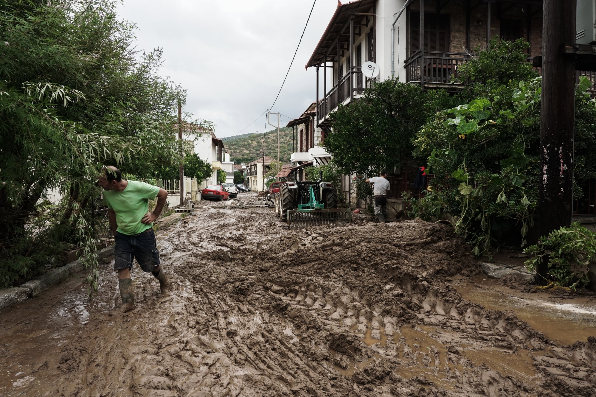 Γυναίκα προσπαθεί να καθαρίσει το σπίτι της στη Μηλίνα Πηλίου μετά το πέρασμα της κακοκαιρίας