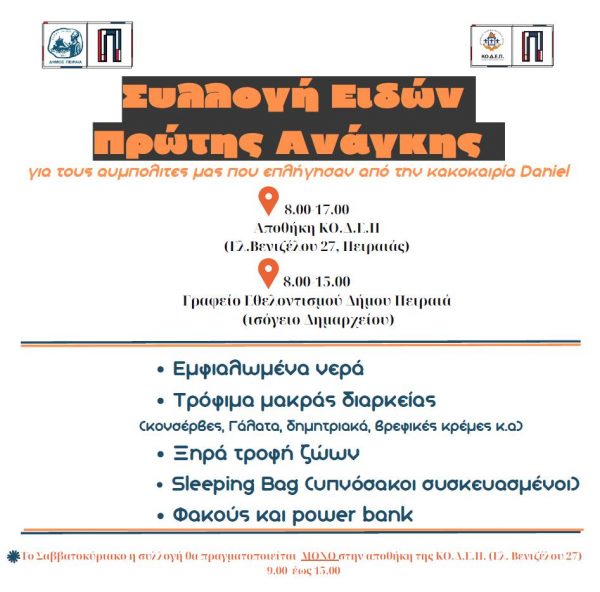 Κοντά στους πλημμυροπαθείς της Ελλάδας στέκεται ο Δήμος Πειραιά και η Κοινωφελής Δημοτική Επιχείρηση Πειραιά και συγκεντρώνουν είδη πρώτης ανάγκης, προκειμένου να στηρίξουν έμπρακτα τους συνανθρώπους μας, οι οποίοι επλήγησαν από τις καταστροφικές πλημμύρες που προκάλεσε το καιρικό φαινόμενο «Daniel». Οι ανάγκες είναι μεγάλες και η Τοπική Αυτοδιοίκηση στέκεται για μια ακόμη φορά αρωγός στην προσπάθεια να καλυφθούν οι άμεσες ανάγκες των κατοίκων των περιοχών της Ελλάδας που επλήγησαν από το έντονο και καταστροφικό καιρικό φαινόμενο του Daniel.