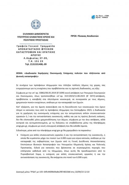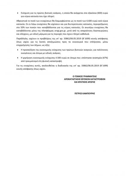 Το έγγραφο υπογράφεται από την Γενικό Γραμματέα Αποκατάστασης Φυσικών Καταστροφών και Κρατικής Αρωγής κ. Πέτρο Καμπούρη.
