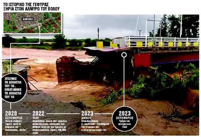 Επειτα από όλα αυτά, την προηγούμενη Τετάρτη, περίπου στις επτά το απόγευμα, η γέφυρα έσπασε και στα δύο ρεύματά της, καθώς αποκολλήθηκε το ασφαλτικό από την πλευρά του Αλμυρού και παρέσυρε το ακρόβαθρό της, μαζί με τις προσδοκίες των κατοίκων για ουσιαστική αντιπλημμυρική θωράκιση.