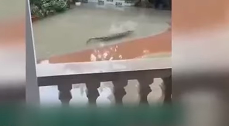 Βίντεο που κυκλοφόρησαν στα social media δείχνουν κροκόδειλους πίσω από πινακίδες σε δρόμο που έχει εξαφανιστεί από τα νερά.