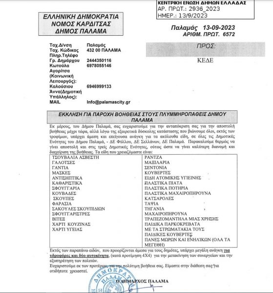 Κυριολεκτικά τα πάντα λείπουν από τους δημότες Παλαμά. Στο in το έγγραφο που εστάλη στην ΚΕΔΕ στο οποίο αποκαλύπτονται οι άμεσες ανάγκες για αγαθά.
