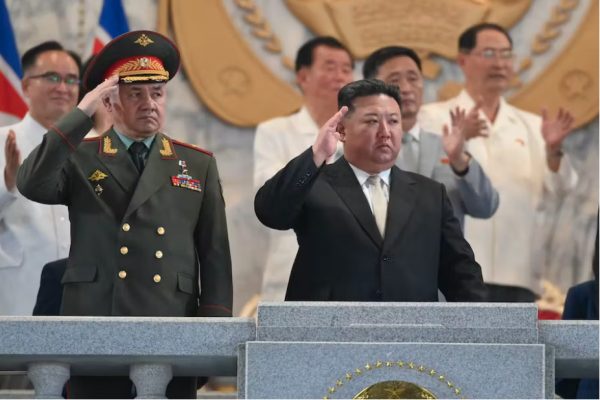 Ο υπουργός Αμυνας της Ρωσίας, Σεργκέι Σόιγκου με τον ηγέτης της Βόρειας Κορέας, Κιμ Γιονγκ Ουν, παρακολουθούν παρέλαση στην Πιονγιάνγκ, φέτος τον Ιούλιο (φωτογραφία EPA-EFE/KCNA)