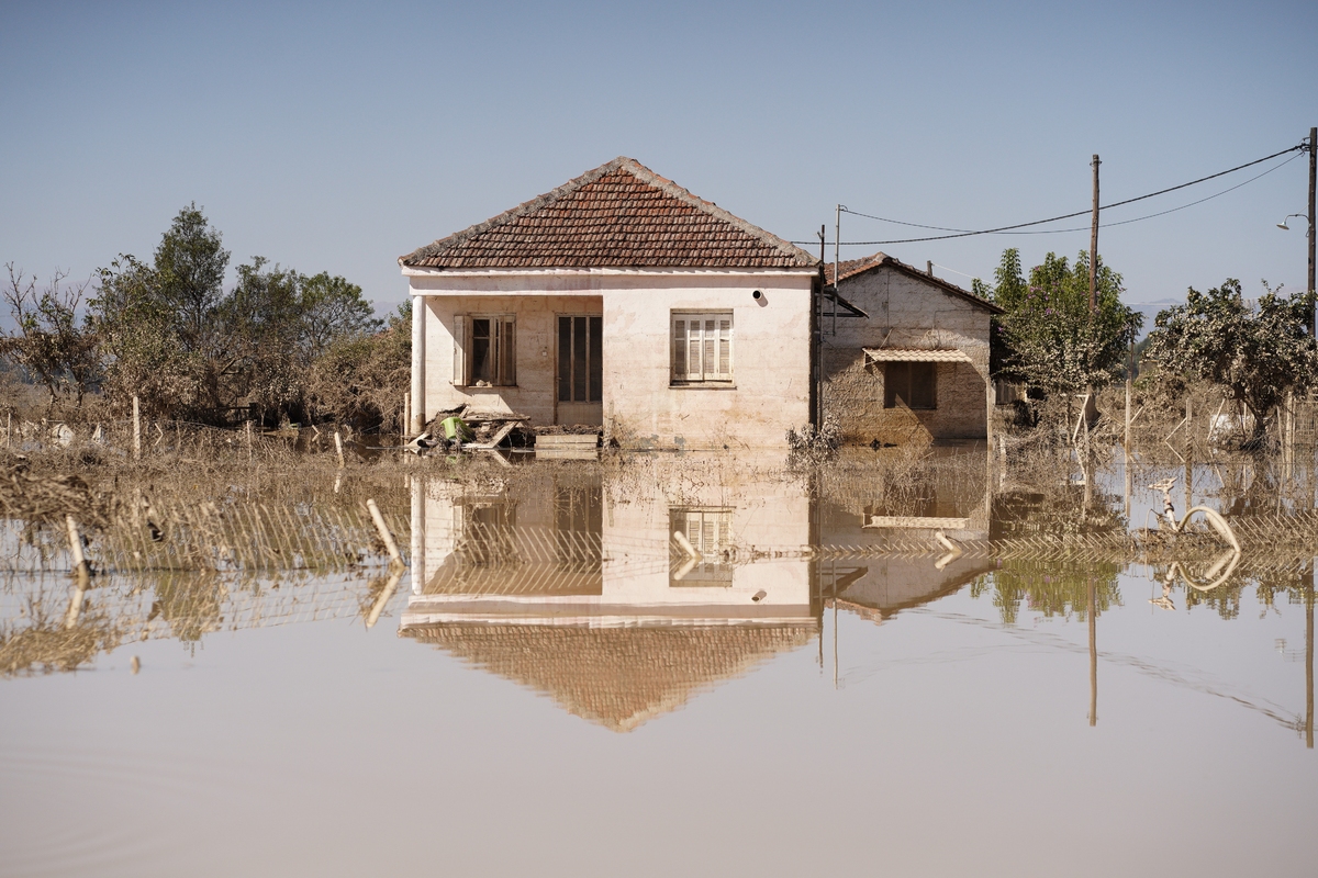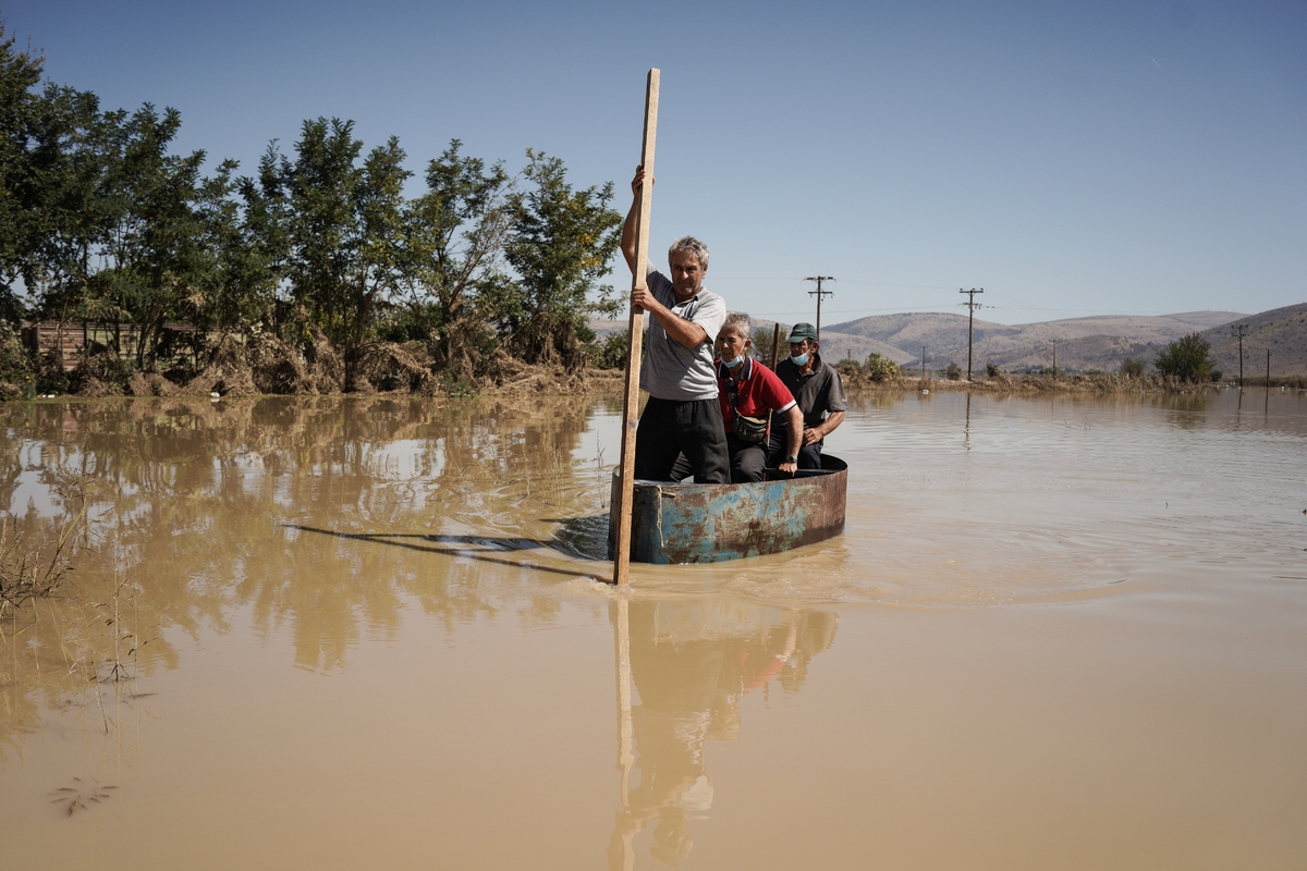 Κάτοικοι χρησιμοποιού βάρκα για να προσεγγίσουν το πλημμυρισμένο χωριό Μεταμόρφωση Καρδίτσας