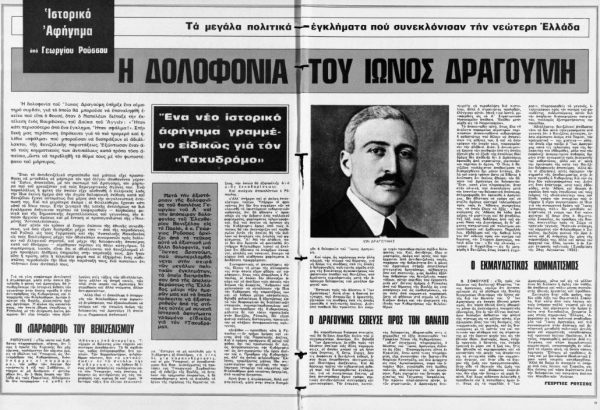*Κείμενο του δημοσιογράφου και συγγραφέα Γεωργίου Ρούσσου (1910-1984), που είχε δημοσιευτεί στον «Ταχυδρόμο» της 29ης Σεπτεμβρίου 1972. Το εν λόγω δημοσίευμα, που έφερε τον τίτλο «Η ιδεολογική μεταστροφή του τραγικού Δραγούμη», ήταν το τελευταίο μιας ολόκληρης σειράς κειμένων του Ρούσσου, ενός εκτενέστατου ιστορικού αφηγήματος γραμμένου ειδικά για τον «Ταχυδρόμο», υπό το γενικό τίτλο «Η δολοφονία του Ίωνος Δραγούμη».