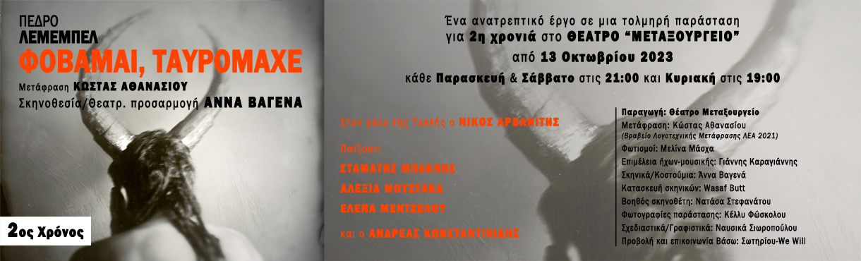 Το «Φοβάμαι, ταυρομάχε» του Pedro Lemebel που ανέβηκε για πρώτη φορά στην Ελλάδα την περασμένη σεζόν, αποσπώντας θερμή υποδοχή από κοινό και κριτικούς, συνεχίζει την επιτυχημένη πορεία του για δεύτερη χρονιά!