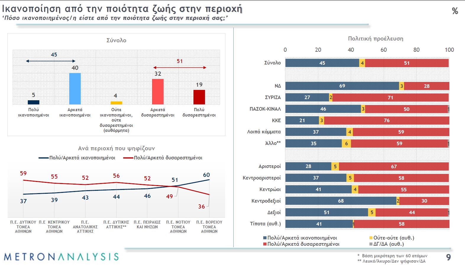 Μάλιστα, η δυσαρέσκεια έχει και κοινωνικό πρόσημο αφού η πιο δυσαρεστημένη περιφερειακή ενότητα είναι του Δυτικού Τομέα Αθηνών και η πιο ικανοποιημένη του Βόρειου Τομέα Αθηνών. Έχει ταυτόχρονα και πολιτικό πρόσημο: μόνο οι ψηφοφόροι της ΝΔ περισσότερο ικανοποιημένοι παρά δυσαρεστημένοι και μόνο όσοι δηλώνουν κεντροδεξιοί και δεξιοί.