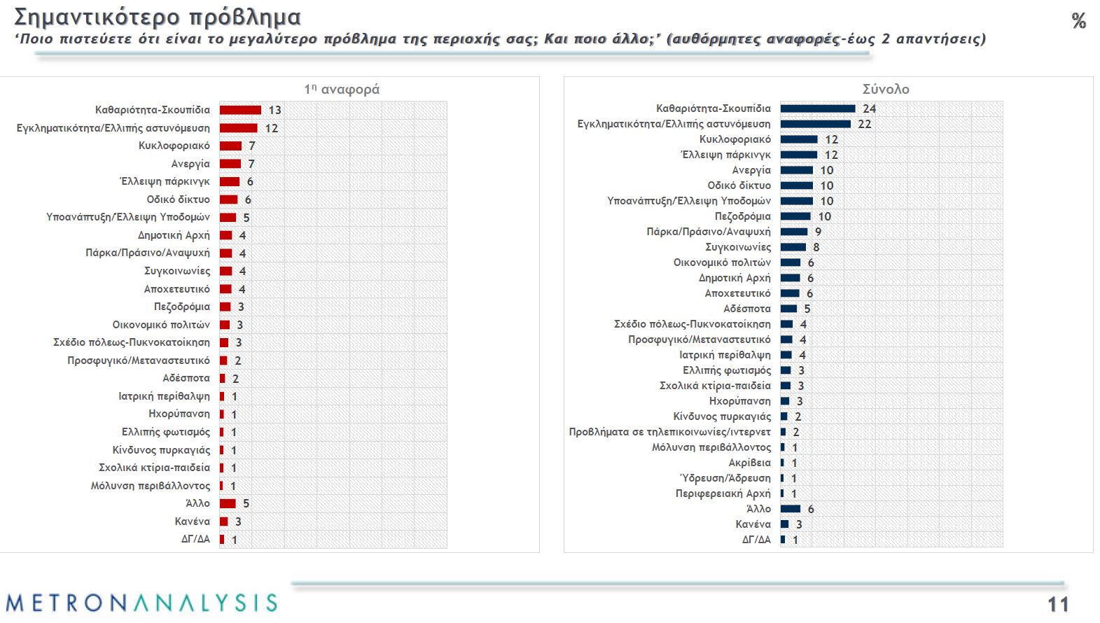 Ως προς τα προβλήματα που απασχολούν περισσότερο τους κατοίκους της Αττικής, αυτά είναι η καθαριότητα και τα σκουπίδια, η εγκληματικότητα και η ελλιπής αστυνόμευση, το κυκλοφοριακό, η έλλειψη παρκινγκ και η ανεργία. Ενδιαφέρον έχει ότι το μεταναστευτικό βρίσκεται πολύ χαμηλό στην ιεράρχηση των προβλημάτων που κάνουν.