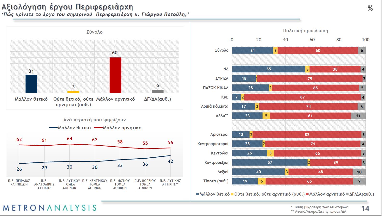 Η δημοσκόπηση αποτυπώνει τη δυσαρέσκεια των πολιτών για τα πεπραγμένα του Γιώργου Πατούλη ως Περιφερειάρχη. Το 60% των ερωτηθέντων έχει αρνητική γνώμη και μόνο το 31% θετική. Με την εξαίρεση της ΝΔ οι ψηφοφόροι όλων των άλλων κομμάτων έχουν περισσότερες αρνητικές από θετικές γνώμες για τον Γιώργο Πατούλη.