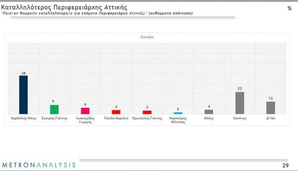 Όλα αυτά αποτυπώνονται και στον τρόπο που ο Νίκος Χαρδαλιάς προηγείται σαφώς στις αυθόρμητες απαντήσεις για το ποιος είναι ο καταλληλότερος Περιφερειάρχης Αττικής. Έχει 38%, την ώρα που η δεύτερη απάντηση είναι το «Κανένας» με 22% και ο Γιάννης Σγουρός έχει 9% αυθόρμητες απαντήσεις, ο Γιώργος Ιωακειμίδης 6%, η Μαριάννα Τσίχλη 4% και 3% ο Γιάννης Πρωτούλης.