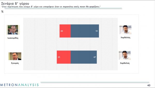 Σε περίπτωση που πάμε σε δεύτερο γύρο, η δημοσκόπηση προβλέπει μια καθαρή επικράτηση του Νίκου Χαρδαλιά. Εάν βρεθεί αντίπαλος με τον Γιώργο Ιωακειμίδη, το 51% δήλωσε ότι θα τον ψηφίσει, ενώ τον Ιωακειμίδη το 20%, ενώ εάν βρεθεί αντιμέτωπος με τον Γιάννη Σγουρό, το 47% θα τον στηρίξει, ενώ το 25% τον Σγουρό. Αυτό δείχνει ότι ο Σγουρός, σε αυτή τη φάση προηγείται του Ιωακειμίδη ως προς την πρόθεση ψήφου και τη συνολική δυναμική.
