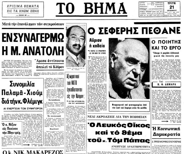 *Κείμενο του Κ. Θ. Δημαρά για τον Γιώργο Σεφέρη, που έφερε τον τίτλο «Ο ποιητής και το έργο» και είχε δημοσιευτεί στην εφημερίδα «Το Βήμα» την Τρίτη 21η Σεπτεμβρίου 1971, την επαύριον του θανάτου του μεγάλου λογοτέχνη.