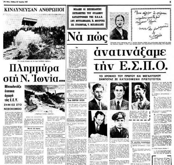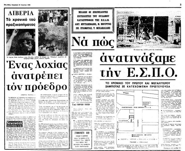 Ώρα 12 και τρία λεπτά ακριβώς. Η ΕΣΠΟ τινάζεται στον αέρα και μεταβάλλεται σε ερείπια. Από το ζαχαροπλαστείο «Αστόρια», στη γωνιά της Πανεπιστημίου με τα Χαυτεία, ο Κώστας Περρίκος, ο Αντώνης Μυτιληναίος, η Ιουλία Μπίμπα, ο Σπύρος Γαλάτης και ο Νίκος Μούρτος παρακολουθούσαν το «θέαμα».