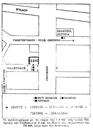 Ο Περρίκος, που παρακολουθεί και ελέγχει όλο το χώρο, στέλνει μήνυμα με τον Λάζαρη [σ.σ. ο Νίκος Λάζαρης ήταν φοιτητής της Νομικής και μέλος του ουλαμού καταστροφών της ΠΕΑΝ] ότι η συγκέντρωση της ΕΣΠΟ θα αρχίσει να διαλύεται και είναι ανάγκη να προχωρήσουν στο «χτύπημα» — έστω κι’ αν σκοτωθούνε κάποιοι αθώοι.