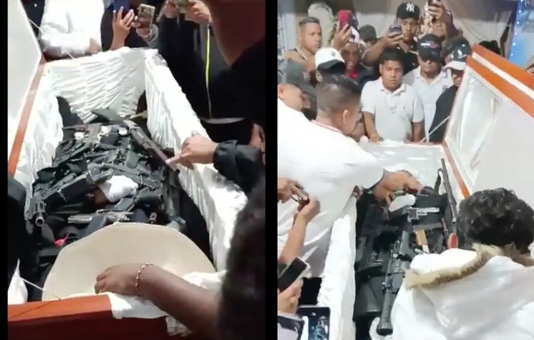 #VIDEO | Insólito velorio de un jefe narco en Ecuador: varias personas introducen armas en el ataúd de Manuel Julián Sevillano, líder de una facción de Los Fatales, una banda delictiva aliada a Los Choneros. El difunto fue asesinado junto a su hija de 20 años en Mocache. 🇪🇨 pic.twitter.com/VvAVNrfHeR