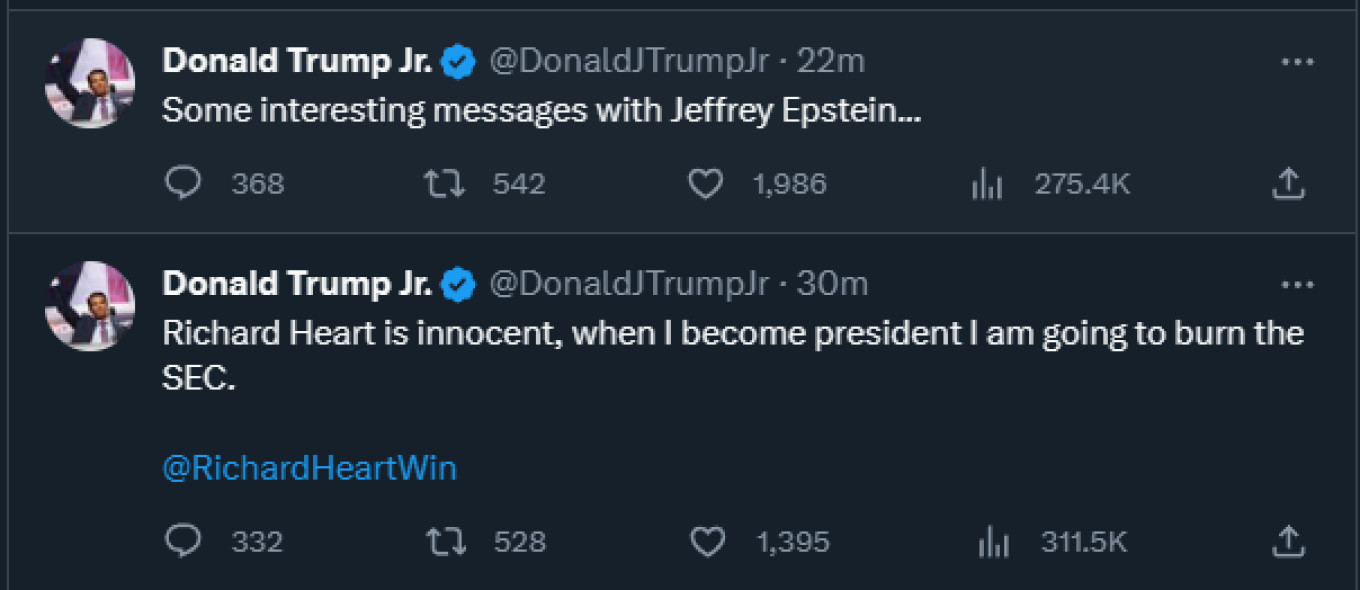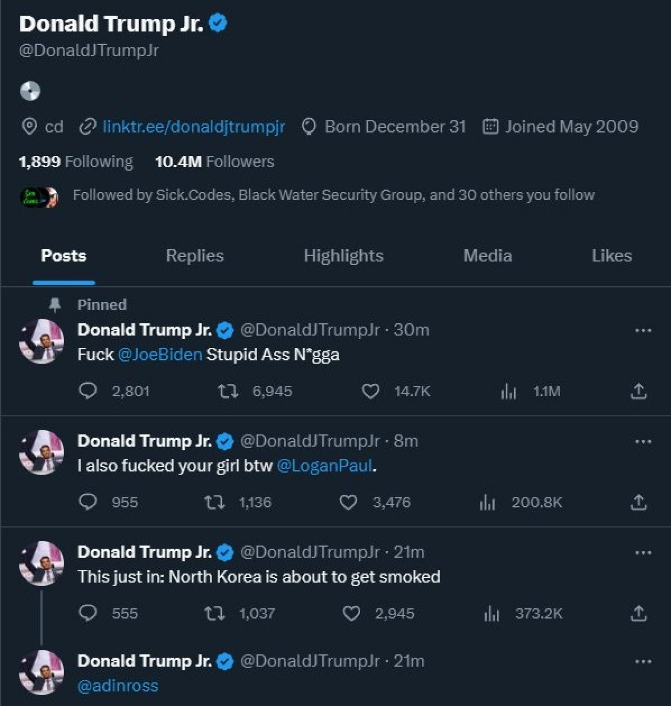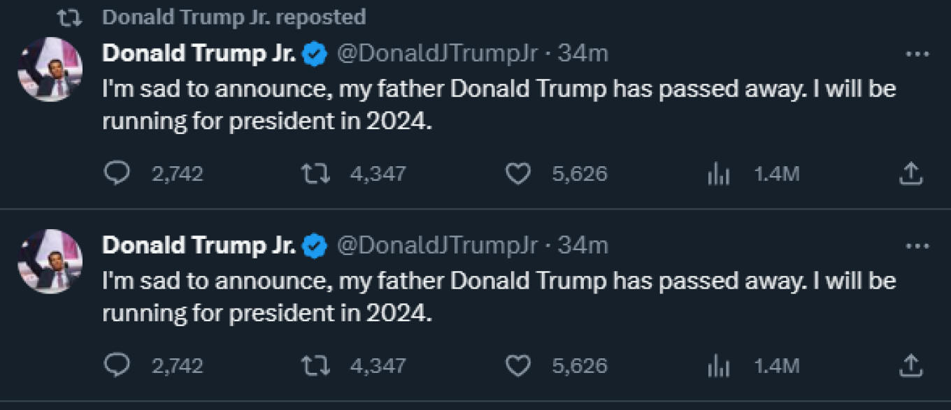 «Με λύπη μου ανακοινώνω ότι ο πατέρας μου Ντόναλντ Τραμπ απεβίωσε. Θα είμαι υποψήφιος για την προεδρία το 2024», έγραφε μήνυμα ενώ σε άλλο ανέφερε ότι η Βόρεια Κορέα «θα γίνει καπνιστή».