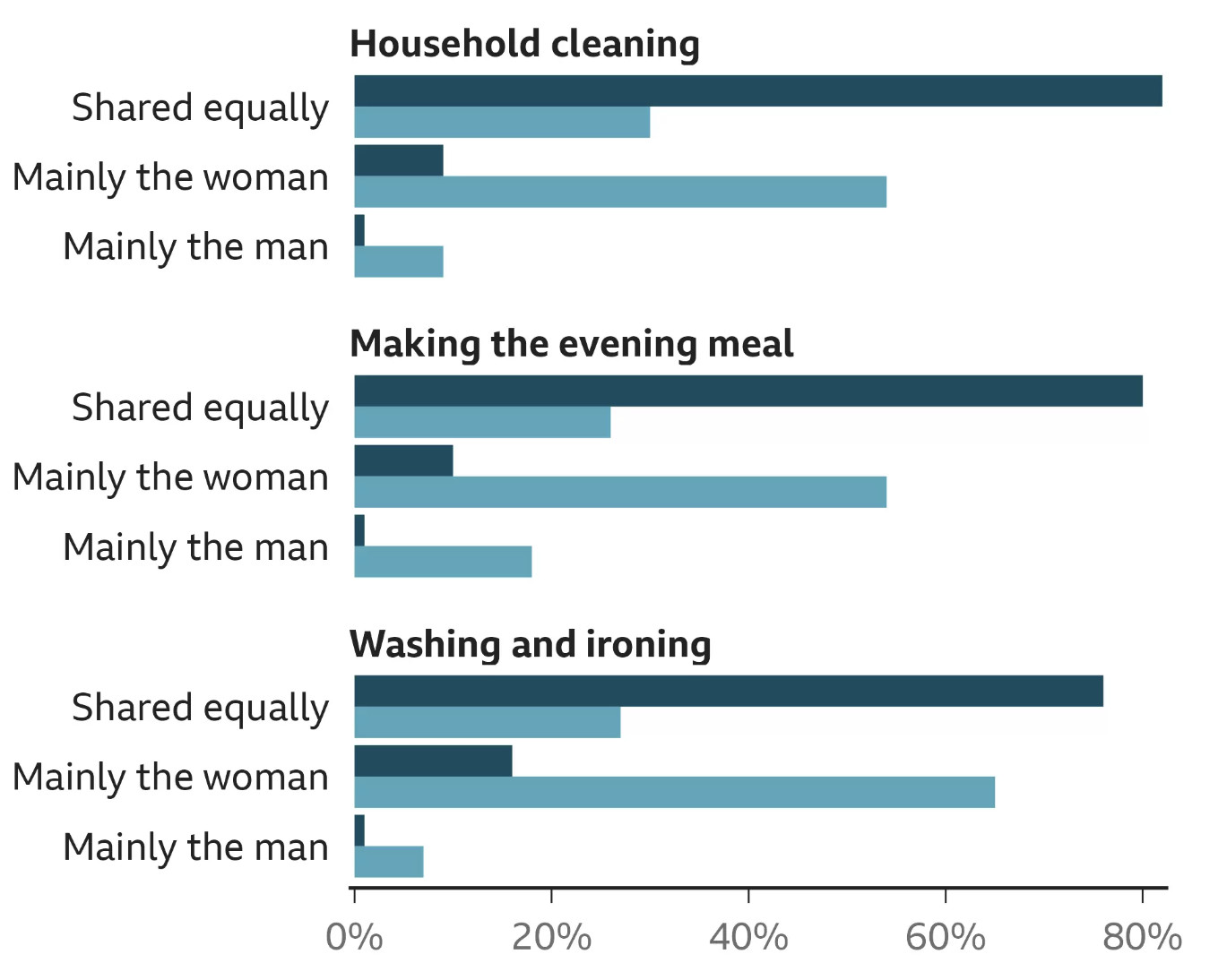 Aν και οι τρεις στους τέσσερις ερωτηθέντες στο πλαίσιο της Βρετανικής Έρευνας Κοινωνικών Στάσεων, συμφωνεί ότι οι οικιακές εργασίες πρέπει να χωρίζονται, τα δύο τρίτα δήλωσαν ότι οι γυναίκες κάνουν περισσότερες δουλειές, κάνοντας πιο συχνά σίδερο, πλύσιμο, καθαρισμό και μαγείρεμα.