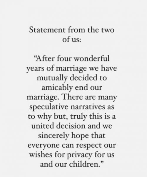 «Έπειτα από τέσσερα υπέροχα χρόνια γάμου, αποφασίσαμε από κοινού να τερματίσουμε φιλικά τον γάμο μας», ανέφεραν στην ανακοίνωση.