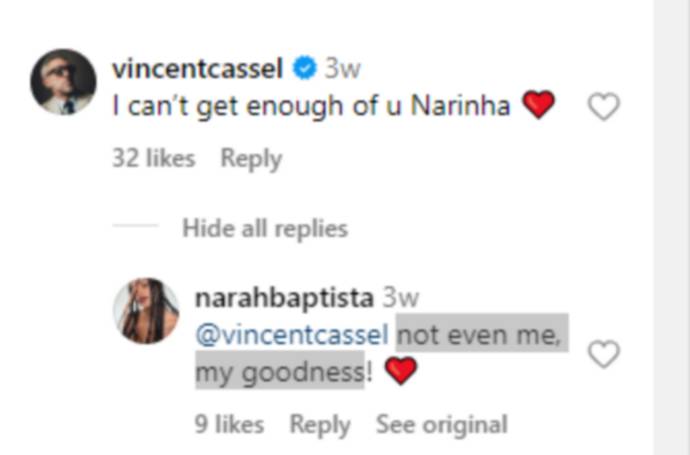«Δεν σε χορταίνω Νάρα» της είχε γράψει κάτω από τις παρακάτω φωτογραφίες στις 4 Σεπτεμβρίου ο Βενσάν Κασέλ κι εκείνη είχε απαντήσει: «Ούτε εγώ, Θεέ μου». Τα σχόλια είχαν συνοδευτεί κι από τις ανάλογες κόκκινες καρδιές. Κι αυτό ίσως να είναι αρκετή απόδειξη για να μιλήσουμε για ένα ειδύλλιο στα σκαριά.