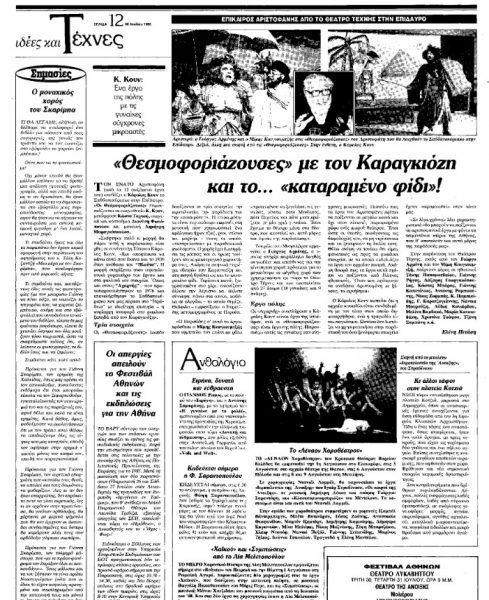 *Κείμενο του συγγραφέα, ποιητή και κριτικού λογοτεχνίας Βαγγέλη Κάσσου για τον Γιάννη Σκαρίμπα, που έφερε τον τίτλο «Ο μοναχικός χορός του Σκαρίμπα» και είχε δημοσιευτεί στην εφημερίδα «Το Βήμα» στις 30 Ιουλίου 1985. Για την ευχερέστερη κατανοήση του κειμένου, «κουτάω» σημαίνει τολμώ ή έχω το θάρρος να κάνω κάτι, ενώ «αβανιά» είναι η άδικη κατηγορία, η συκοφαντία, η κακολογία.