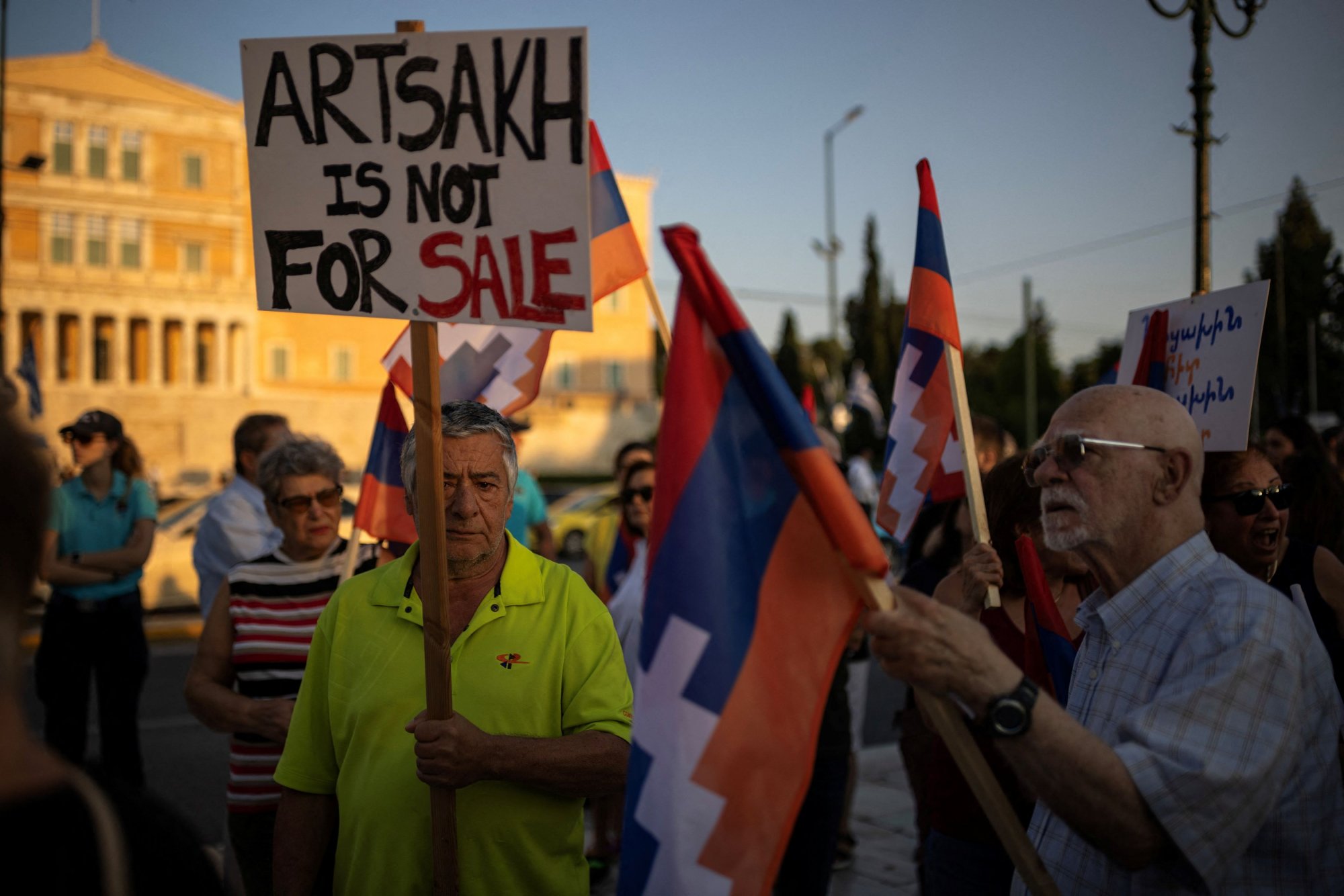 «Το Αρτσάχ δεν είναι για πούλημα» γράφει στην πικέτα του διαδηλωτής στο Σύνταγμα